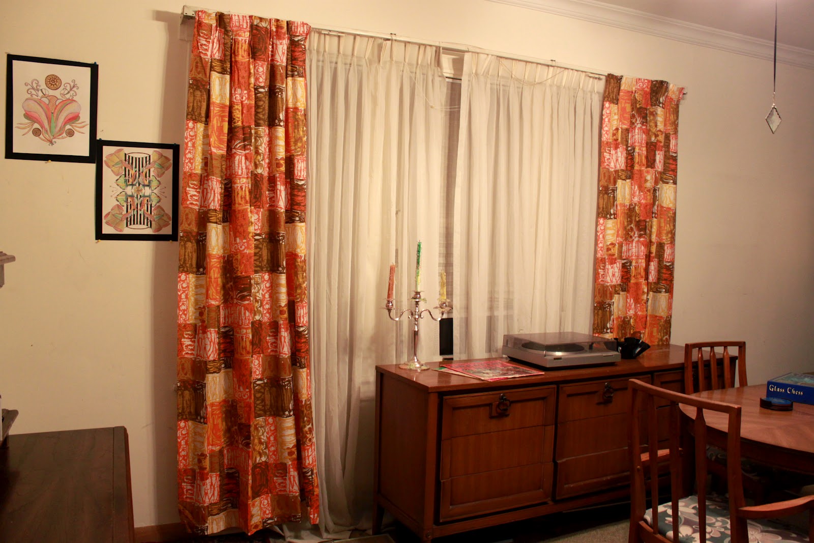 These are the curtain panels I got from the little old Polish woman named Harriet who lives down the street! $4 for these retro 70s babies. Such a sweet old lady. You can see some of my artwork hanging there on the far left and barely see the fabric on the chairs that I recovered for the dining room table sometime last year.